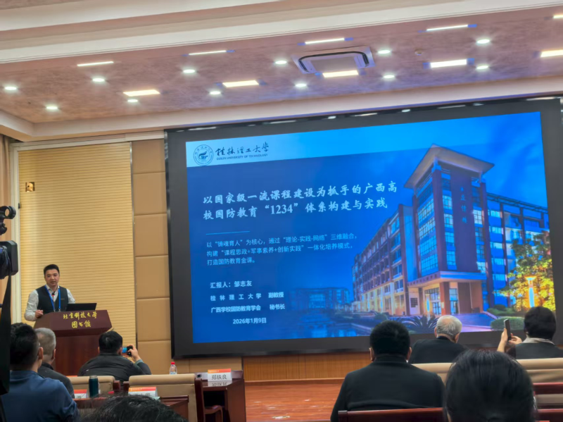 2026年1月8日-9日,第一届北京科技大学“钢铁长城”学校国防教育工作交流会在京举行,广西学校国防教育学会理事会秘书长、桂林理工大学副教授邹志友受邀参会,并作题为“国家级一流课程为抓手的广西高校国防教育‘1234’体系构建与实践”的主旨发言。本次会议邀请了国防大学、西安交通大学的专家进行主旨报告,汇聚全国各省国防教育专家及嘉宾近百人,共同探讨新时代国防教育高质量发展路径。